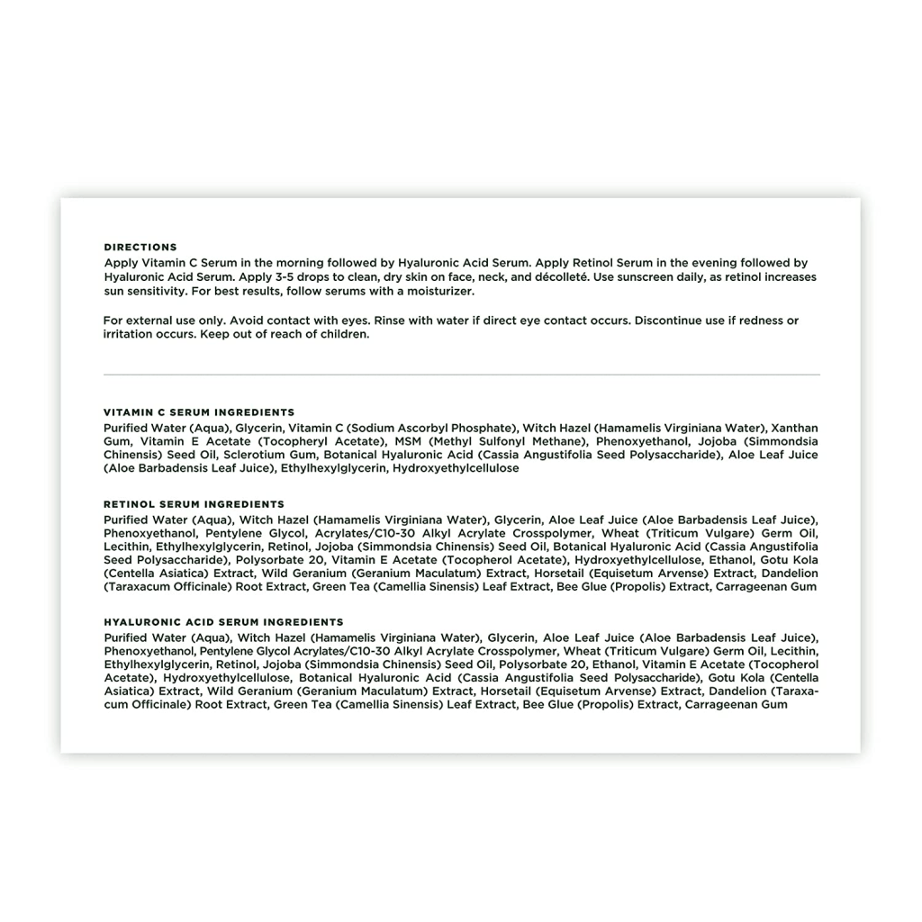 Directions: Apply Vitamin C Serum in the morning followed by Hyaluronic Acid Serum. Apply Retinol Serum in the evening followed by Hyaluronic Acid Serum. Apply 3-5 drops to clean, dry skin on face, neck, and décolleté. Use sunscreen daily, as retinol increases sun sensitivity. For best results, follow serums with a moisturizer.